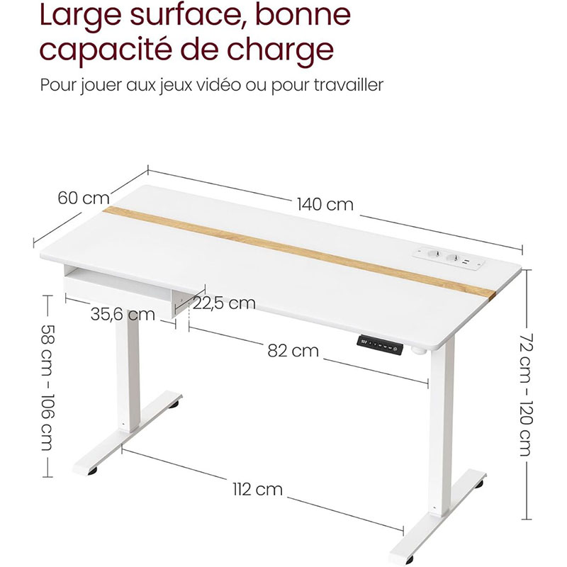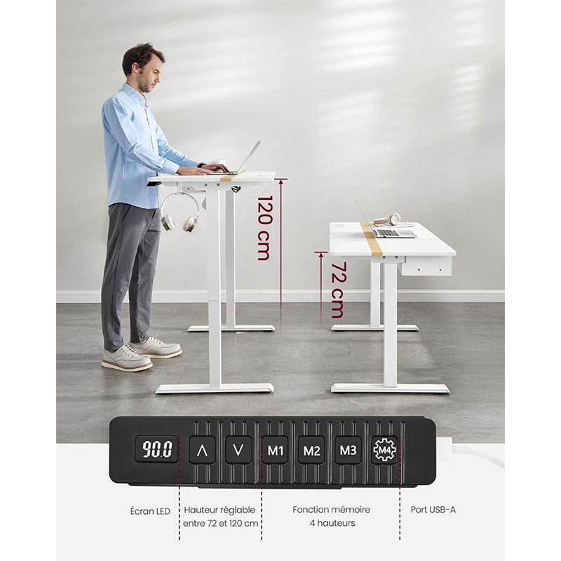 Opremljena s pomnilniško funkcijo za štiri različne višine, zato lahko z enim pritiskom gumba hitro preklopite na svoje najljubše nastavitve. Njena prostrana delovna površina velikosti 60 × 140 cm nudi dovolj prostora za računalnik, monitor, dokumente in druge delovne pripomočke, kar pripomore k urejeni in učinkoviti delovni postavitvi. Zahvaljujoč tihemu motorju je dvigovanje in spuščanje mize skoraj neslišno.