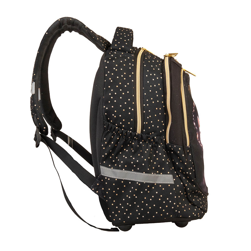 Ergonomski šolski nahrbtnik je nepogrešljiv za vse, ki obiskujejo prvo triado osnovne šole. Opremljen je z večplastnim trdnim dnom, ergonomsko oblikovanim hrbtiščem in zračnim materialom, ki zmanjšuje potenje, s tem pa zagotavlja večje udobje in zadovoljstvo. Poleg trdega hrbtišča ima nahrbtnik tudi trdo in trpežno dno, ki je dvignjeno, da torba ne prihaja v stik z umazanijo ali vodo na tleh. Naramnice so zelo trpežne in se lahko poljubno nastavijo. Za otrokovo varnost poskrbijo vgrajeni odsevniki, zaradi katerih je otrok ponoči viden s katerekoli strani. Izdelan je iz kvalitetnega, zelo trpežnega 600D poliestra.