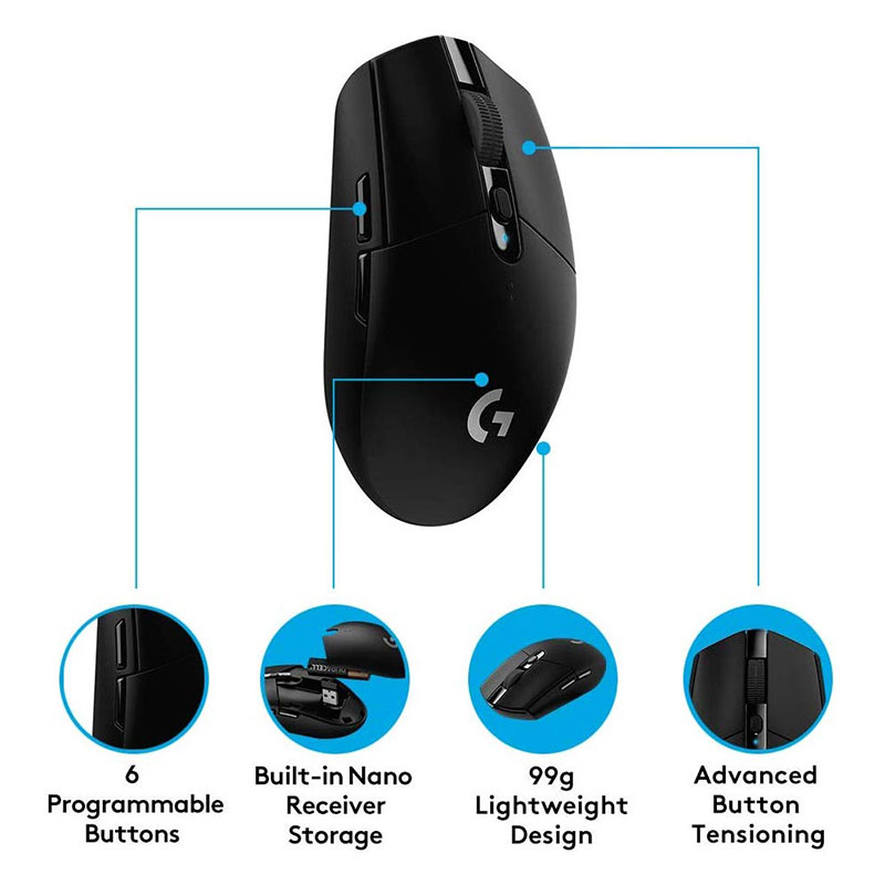 Model ima šest programljivih gumbov, zato ga lahko prilagodite svojemu slogu igranja ali delovnemu toku. Pomembne funkcije vključujejo nastavljivo ločljivost, 250 ur življenjske dobe baterije z eno AA baterijo ter vgrajen prostor za shranjevanje nano USB‑sprejemnika, zaradi česar je priročna tudi za prenašanje. Predstavlja odlično izbiro za igralce in uporabnike, ki želijo zanesljivo brezžično izkušnjo z visoko natančnostjo in odzivnostjo.
