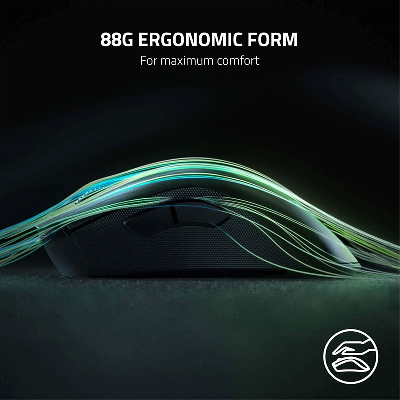 Ergonomska oblika desničarskega modela je zasnovana za dolgotrajno udobje, stranske gume pa zagotavljajo boljši oprijem. Ima visokokakovostne 100 % PTFE podloge za tekoče premikanje po različnih površinah ter 8 programirljivih gumbov, ki jih lahko prilagodite prek programske opreme Razer Synapse. Podpira tudi Razer Chroma RGB osvetlitev z milijoni barv za edinstven videz in usklajevanje s preostalo opremo.