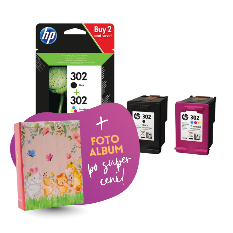 Komplet vsebuje: original kartuše HP nr.302 (BK + CMY) in Foto album Safari 2, 100 slik.
