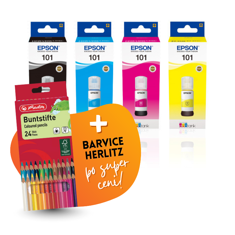 Komplet vsebuje: Original komplet črnil Epson 101 (BK/C/M/Y) in Barvice Herlitz, 24 kosov.