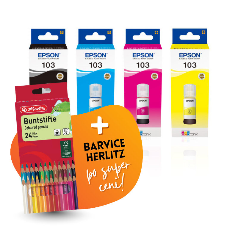 Komplet vsebuje: Original komplet črnil Epson 103 (BK/C/M/Y) in Barvice Herlitz, 24 kosov.