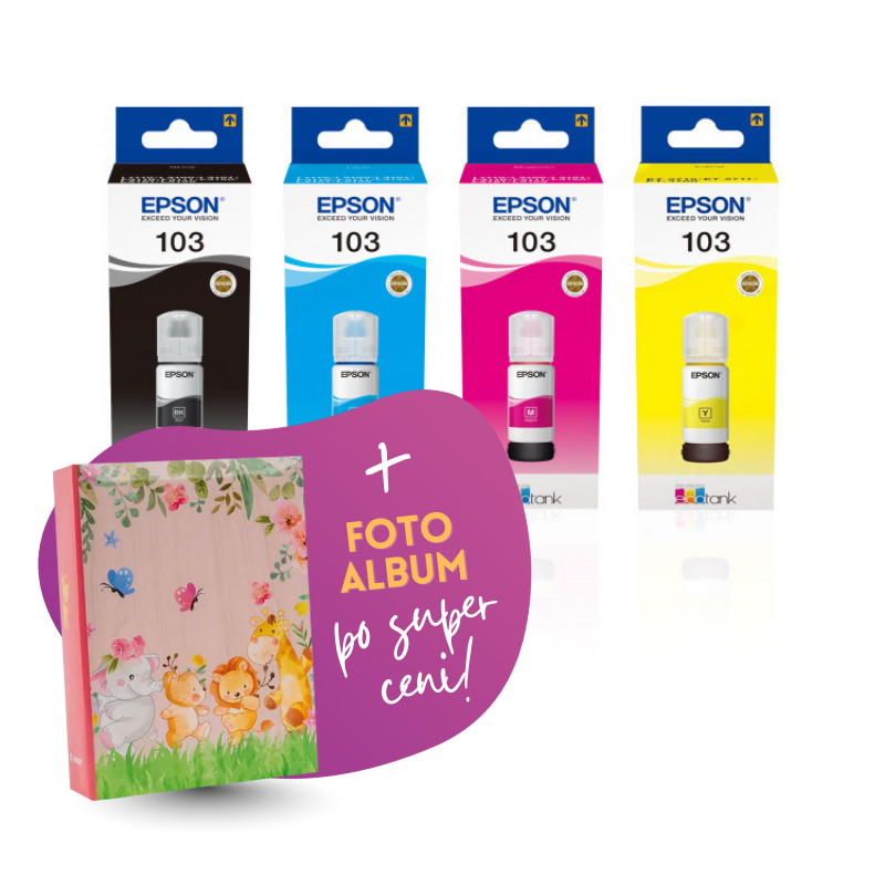Komplet vsebuje: Original komplet črnil Epson 103 (BK/C/M/Y) in Foto album Safari 2, 100 slik.