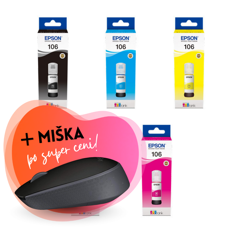 Komplet vsebuje: Original komplet črnil Epson 106 (BK/C/M/Y) in Miška Logitech M171 Wireless, brezžična, siva.