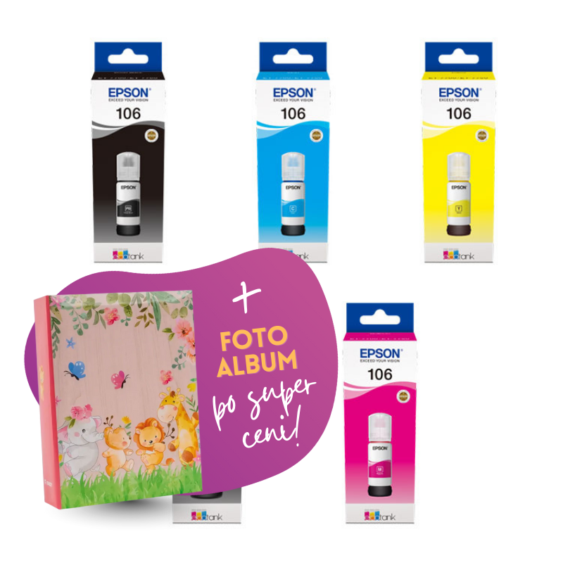 Komplet vsebuje: Original komplet črnil Epson 106 (BK/C/M/Y) in Foto album Safari 2, 100 slik.