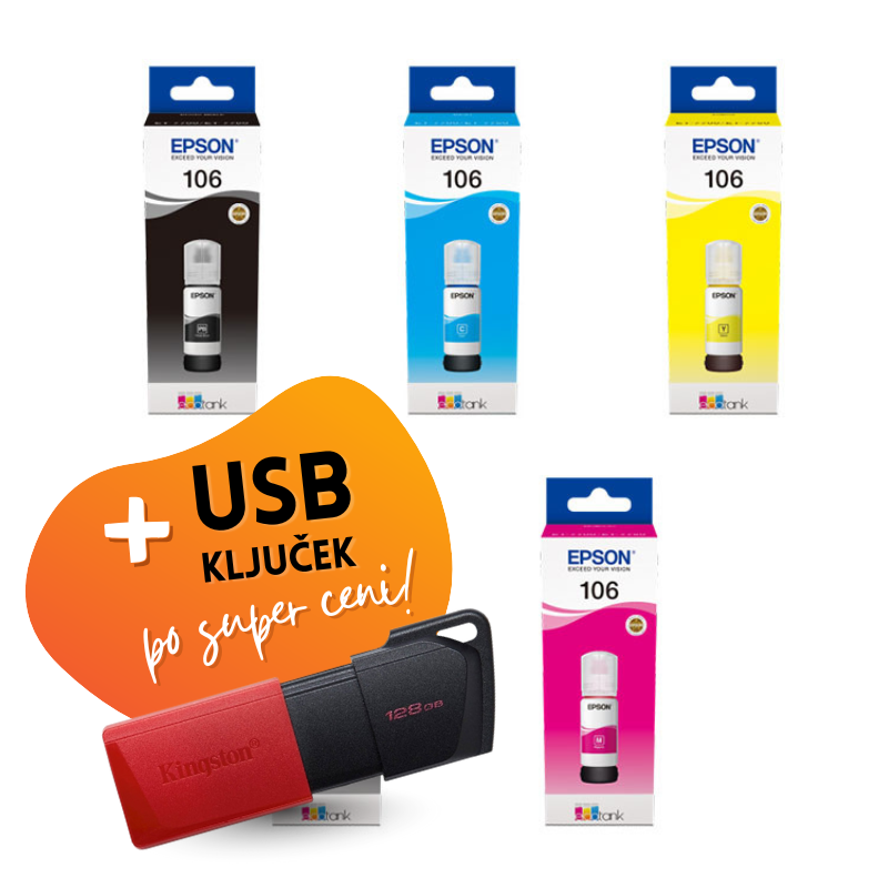 Komplet vsebuje: Original komplet črnil Epson 106 (BK/C/M/Y) in USB ključ Kingston DT Exodia M, 128 GB.