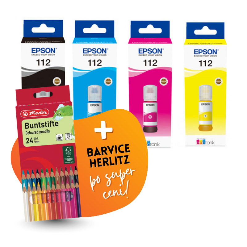 Komplet vsebuje: Original komplet črnil Epson 112 (BK/C/M/Y) in Barvice Herlitz, 24 kosov.