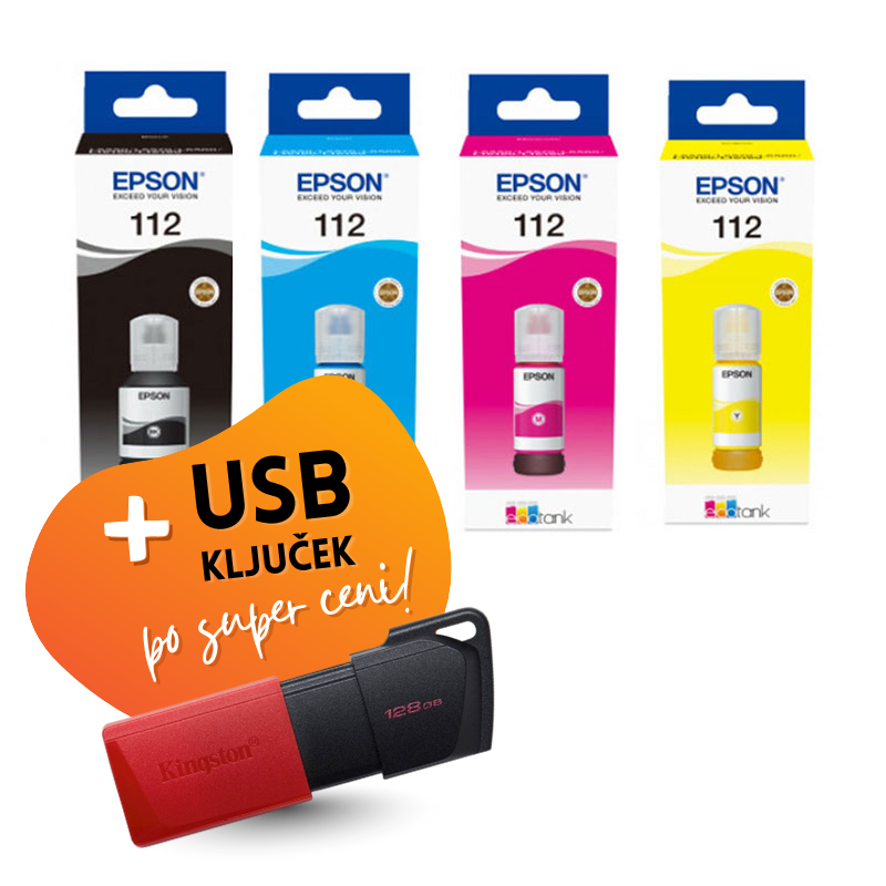 Komplet vsebuje: Original komplet črnil Epson 112 (BK/C/M/Y) in USB ključ Kingston DT Exodia M, 128 GB.