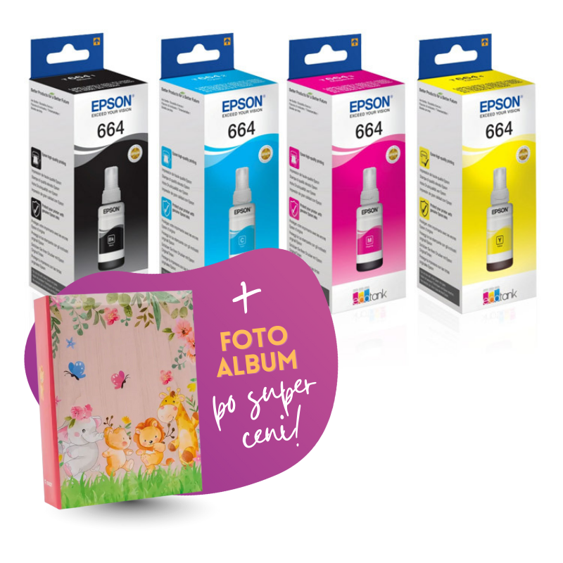 Komplet vsebuje: Original komplet črnil Epson T664 (BK/C/M/Y) in Foto album Safari 2, 100 slik.