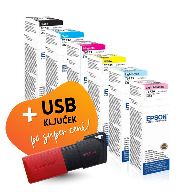 Komplet vsebuje: Original komplet črnil Epson T673 (BK/C/M/Y) in USB ključ Kingston DT Exodia M, 128 GB.