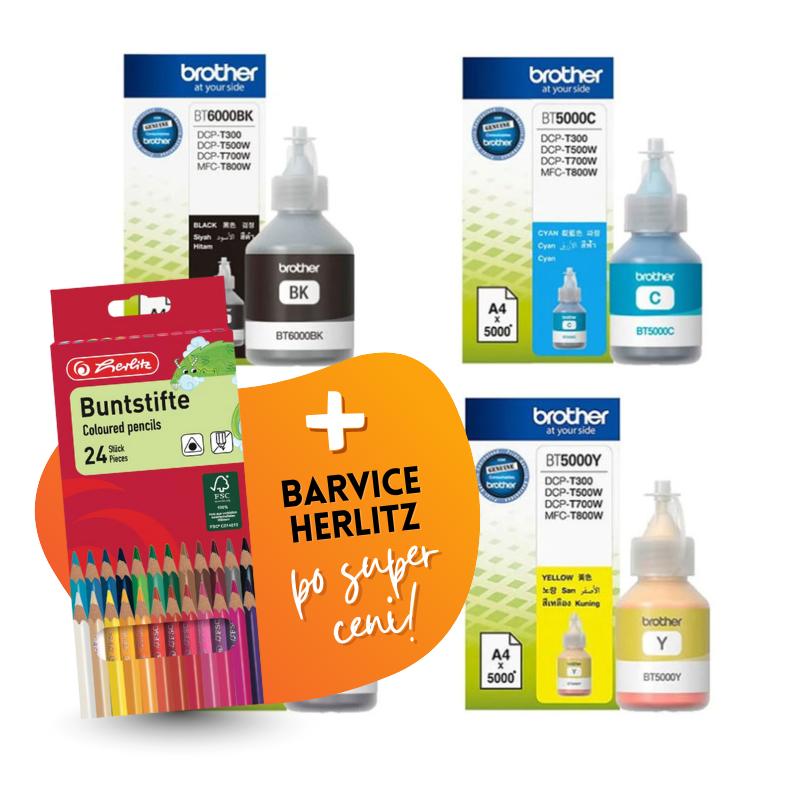 Komplet vsebuje: original kartuše Brother BT-6000 BK + BT-5000 (BK/C/M/Y) in Barvice Herlitz, 24 kosov.