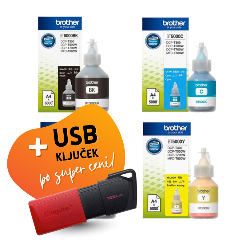 Komplet vsebuje: original kartuše Brother BT-6000 BK + BT-5000 (BK/C/M/Y) in USB ključ Kingston DT Exodia M, 128 GB.