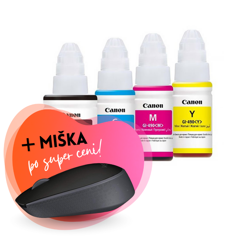 Komplet vsebuje: original črnila Canon GI-490 (BK/C/M/Y) in Miška Logitech M171 Wireless, brezžična, siva.