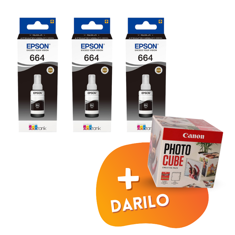 Komplet vsebuje: Original črnilo za Epson C13T66414A (črna), 3 kosi in Foto kocka Canon Creative Pack s foto papirjem in okvirjem.