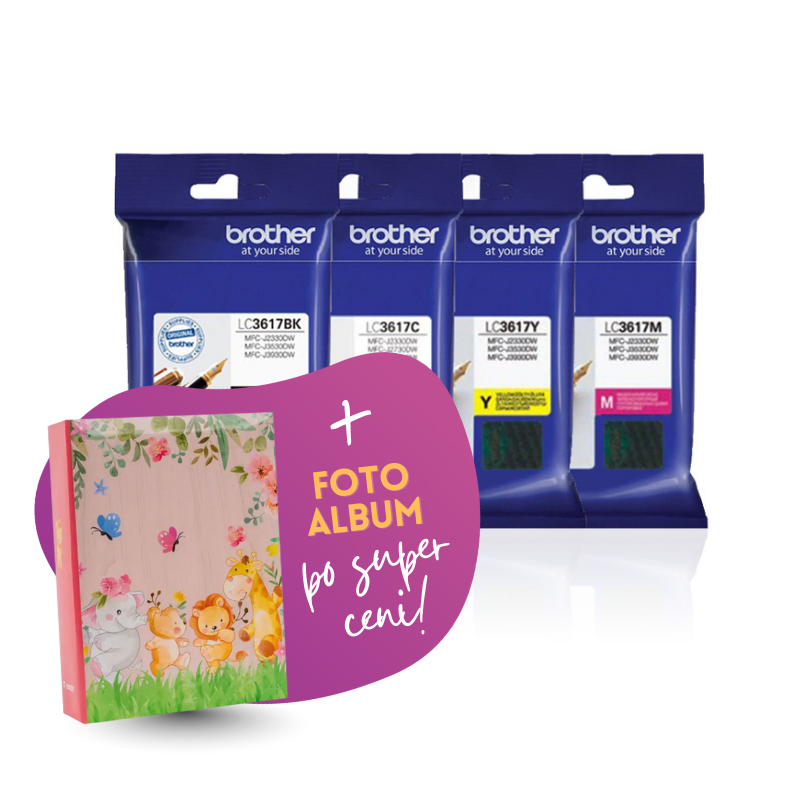 Komplet vsebuje: original kartuše Brother LC3617 (BK/C/M/Y) in Foto album Safari 2, 100 slik.