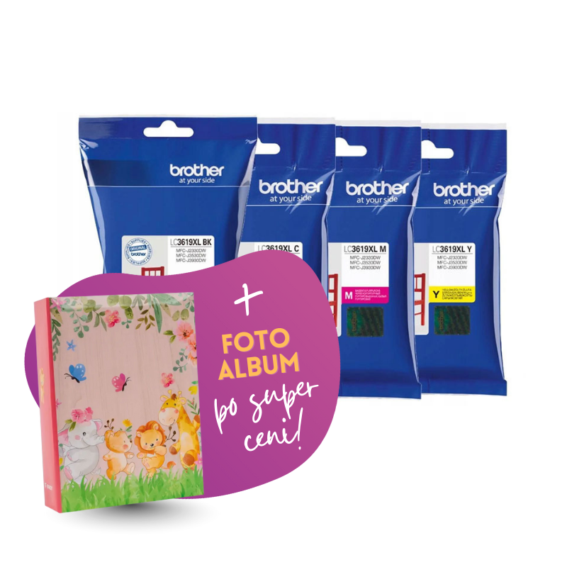 Komplet vsebuje: original kartuše Brother LC3619XL (BK/C/M/Y) in Foto album Safari 2, 100 slik.