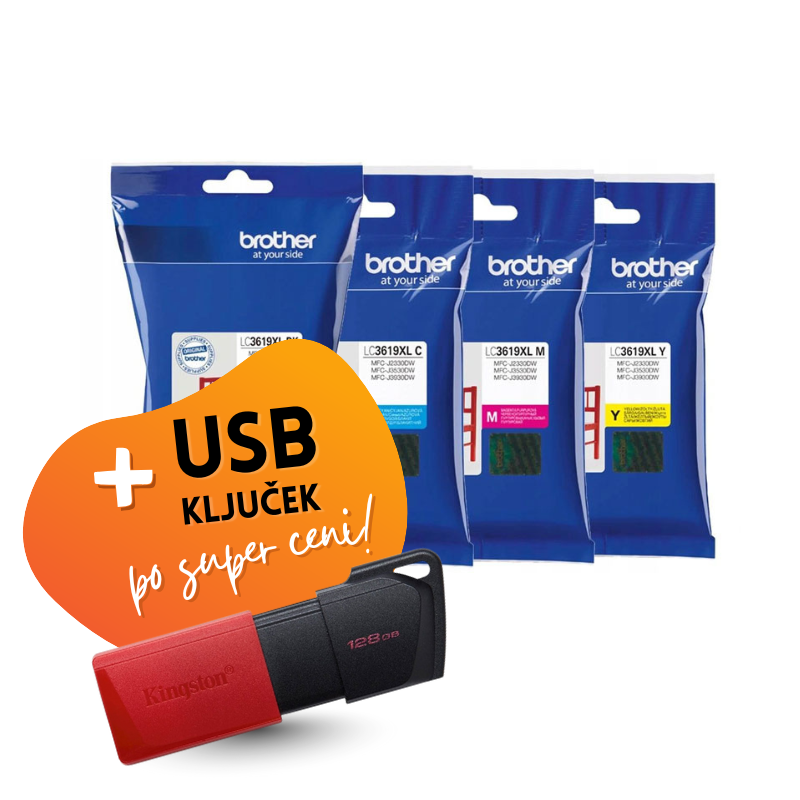 Komplet vsebuje: original kartuše Brother LC3619XL (BK/C/M/Y) in USB ključ Kingston DT Exodia M, 128 GB.