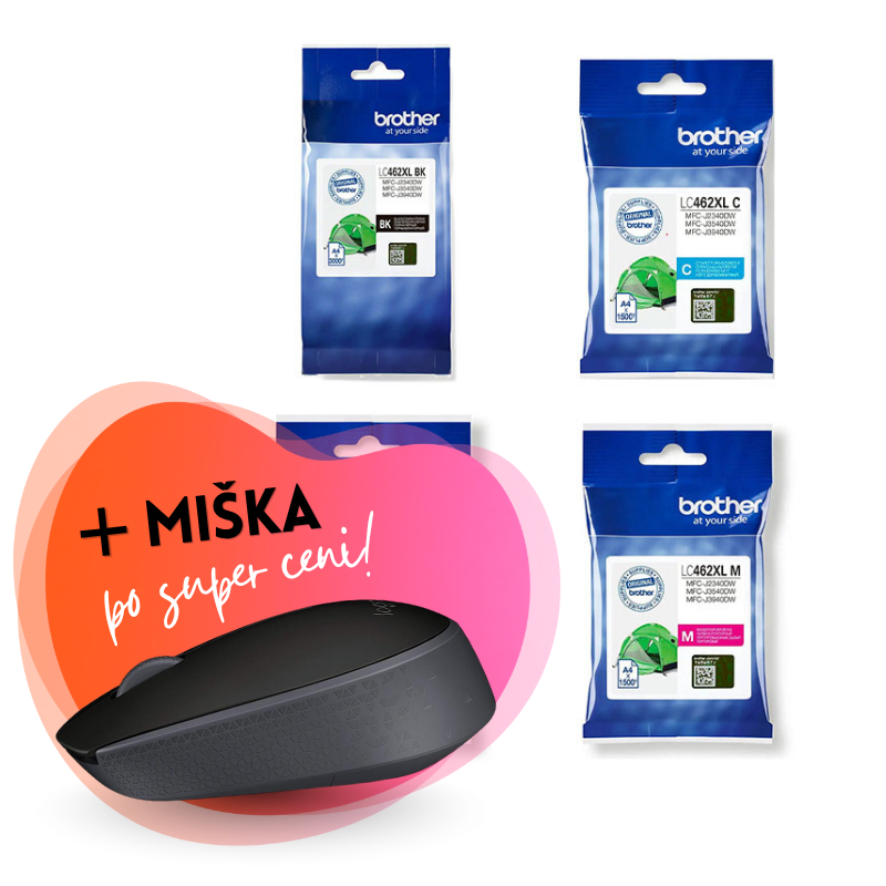 Komplet vsebuje: original kartuše Brother LC462 XL (BK/C/M/Y) in Miška Logitech M171 Wireless, brezžična, siva.