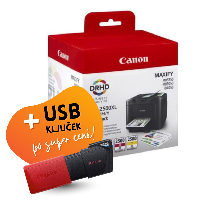 Komplet vsebuje: original kartuše Canon PGI-2500XL (BK/C/M/Y) in USB ključ Kingston DT Exodia M, 128 GB.