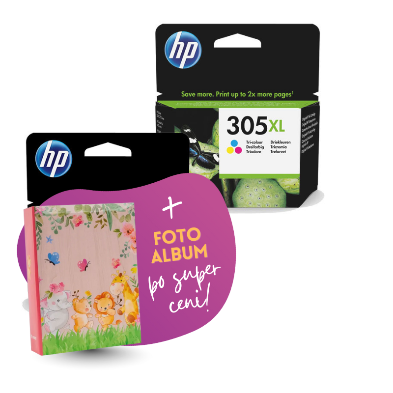 Komplet vsebuje: original kartuše HP nr.305 (BK + CMY) in Foto album Safari 2, 100 slik.