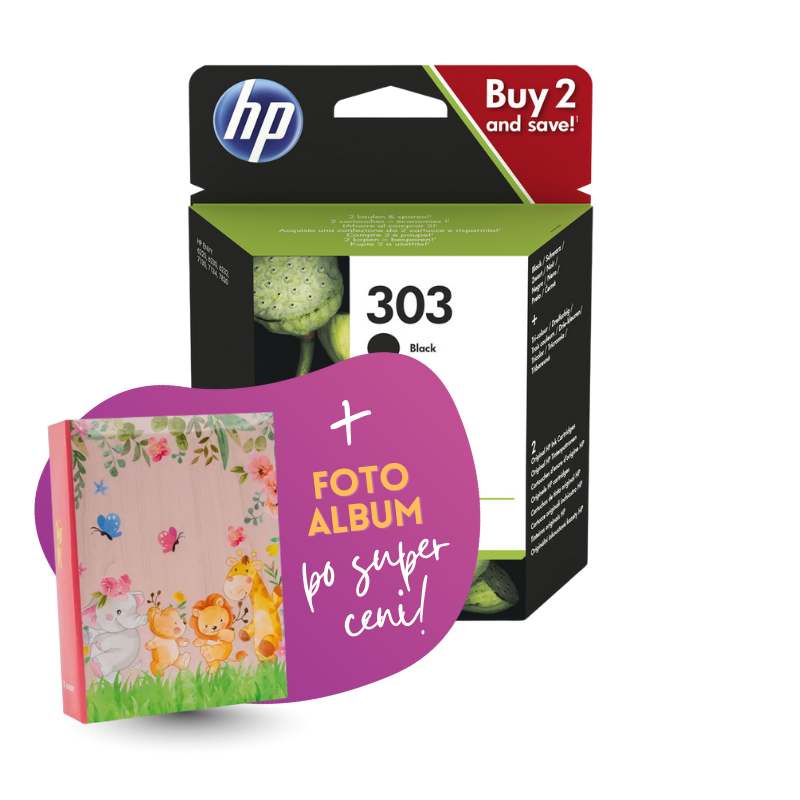 Komplet vsebuje: original kartuše HP nr.303 (BK + CMY) in Foto album Safari 2, 100 slik.