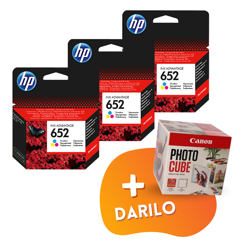 Komplet vsebuje: Original kartušo HP F6V24AE nr.652 (barvna), 3 kosi in Foto kocka Canon Creative Pack s foto papirjem in okvirjem.