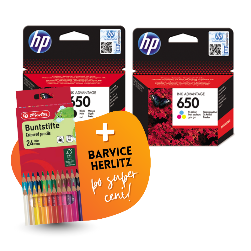 Komplet vsebuje: original kartuše HP nr.650 (BK + CMY) in Barvice Herlitz, 24 kosov.