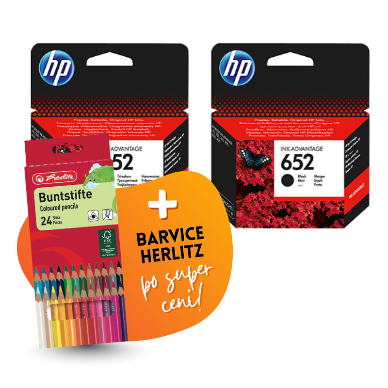 Komplet vsebuje: original kartuše HP nr.652 (BK + CMY) in Barvice Herlitz, 24 kosov.