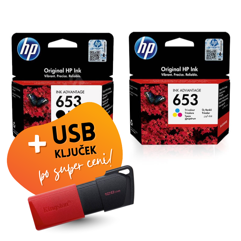 Komplet vsebuje: original kartuše HP nr.653 (BK + CMY) in USB ključ Kingston DT Exodia M, 128 GB.