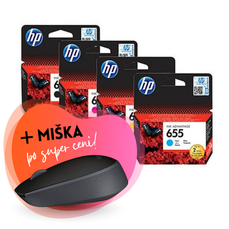 Komplet kartuš HP nr.655 (BK/C/M/Y), original + brezžična miška po SUPER ceni
