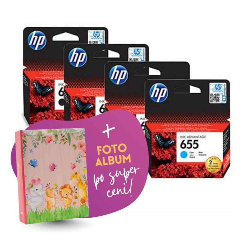 Komplet vsebuje: original kartuše HP nr.655 (BK + CMY) in Foto album Safari 2, 100 slik.
