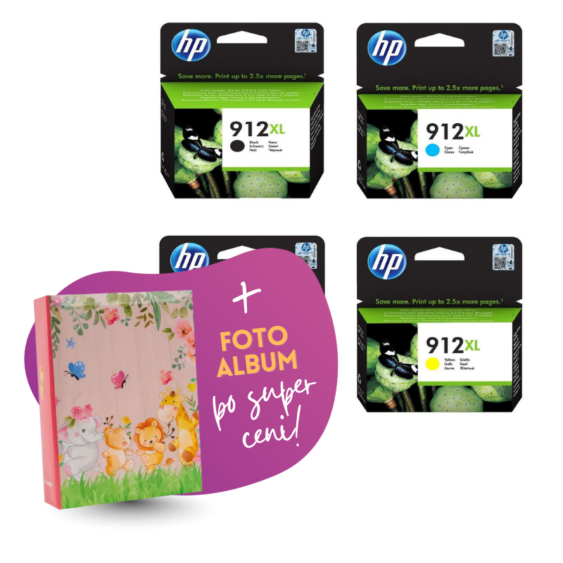 Komplet vsebuje: original kartuše HP nr.912 (BK + CMY) in Foto album Safari 2, 100 slik.
