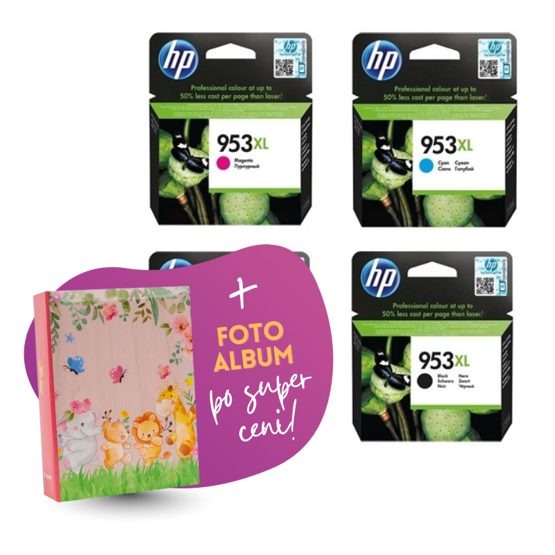 Komplet vsebuje: original kartuše HP nr.953 (BK + CMY) in Foto album Safari 2, 100 slik.