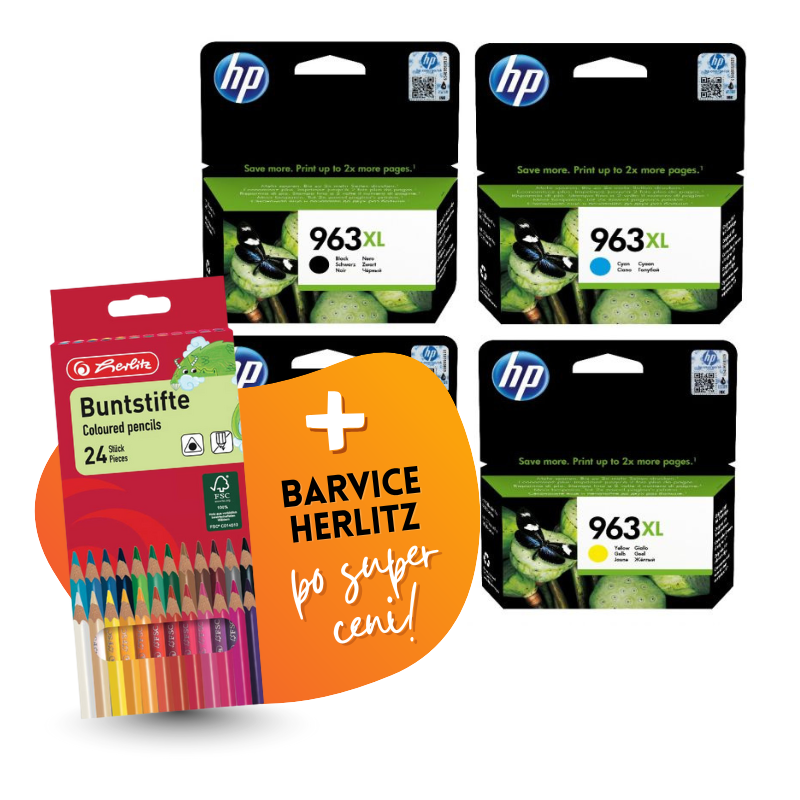 Komplet vsebuje: original kartuše HP nr.963 (BK + CMY) in Barvice Herlitz, 24 kosov.