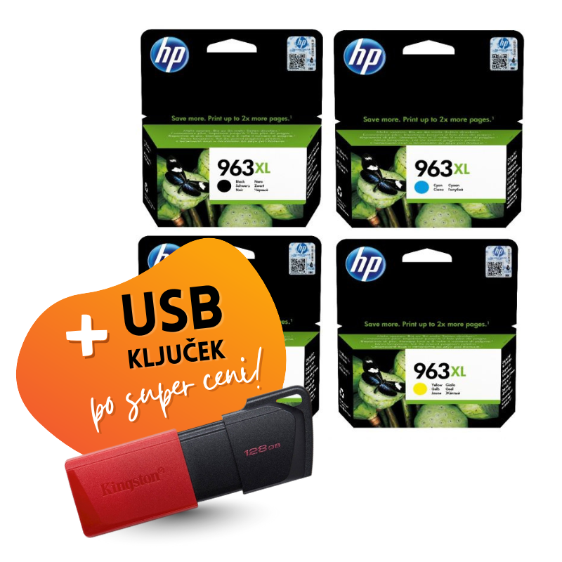 Komplet vsebuje: original kartuše HP nr.963 (BK + CMY) in USB ključ Kingston DT Exodia M, 128 GB.