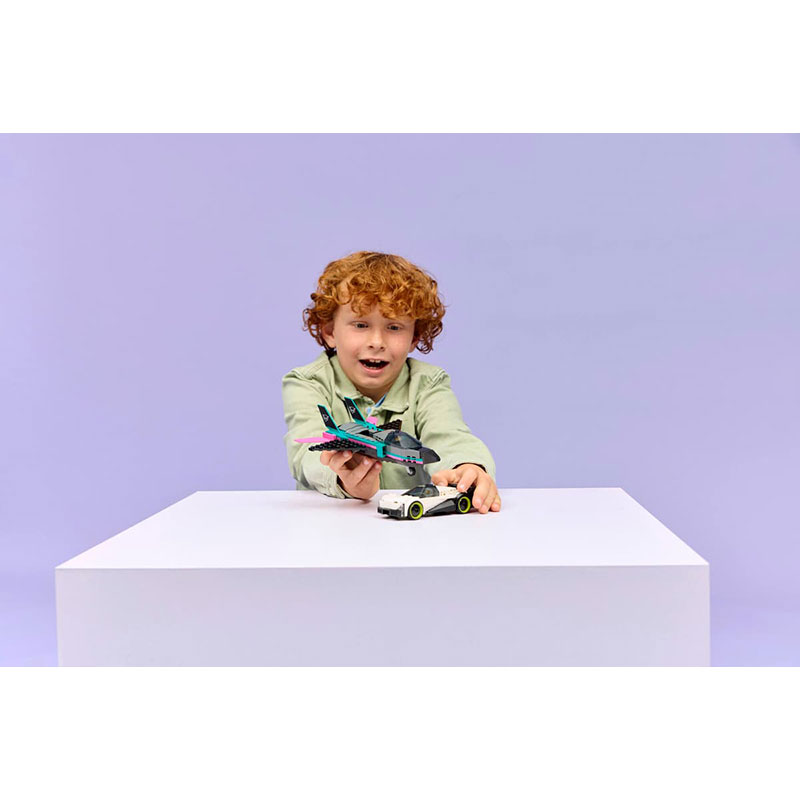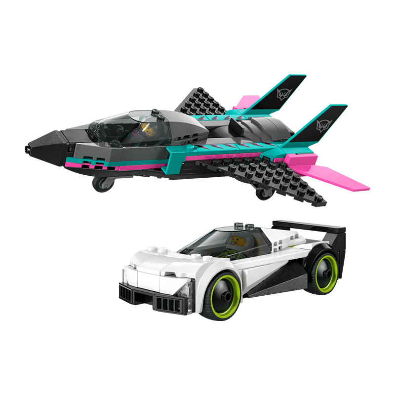 Zabaven komplet, ki prinaša dvojno dozo dirkalne akcije za vse male ljubitelje hitrosti. Komplet vključuje eleganten superšportni avtomobil in supersonično letalo za napeto domišljijsko dirkanje na tleh in v zraku. Letalo ima nazaj pomaknjena krila, dvojne navpične stabilizatorje in funkcijo naknadnega zgorevanja, ki jo otroci aktivirajo z drsnikom. Superavtomobil pa ima odpirajočo se kabino z natančno izdelano notranjostjo in dirkalnim sedežem. V kompletu sta tudi