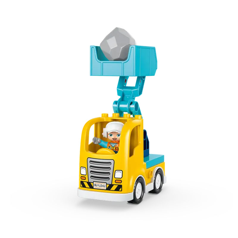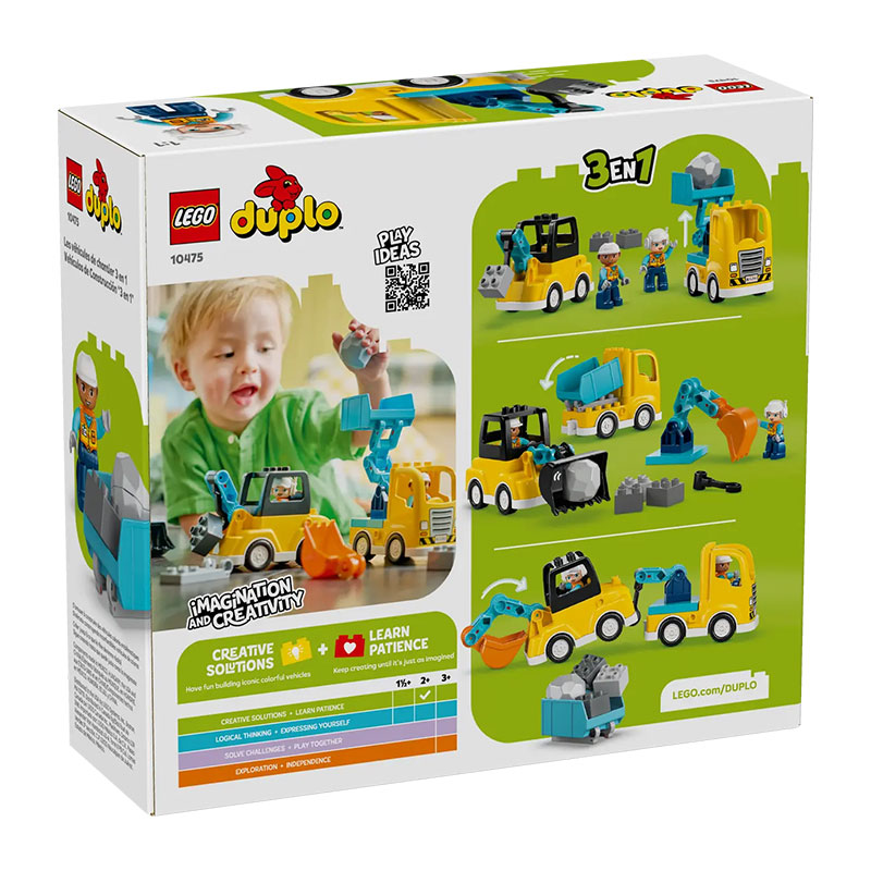 Barvit in ustvarjalen set, ki malčkom omogoča prve zabavne korake v svet sestavljanja. Set omogoča sestavljanje kar šestih različnih vozil, kot so nakladalnik z nagibnim koritom, prekucnik, bager, avto dvigalo z vrtečim se ročajem ali dvigalo z manjšim kavljem, s čimer otroci razvijajo domišljijo, reševanje problemov, vztrajnost in fino motoriko. Vključeni sta tudi dve figurici. Enostavne, varne in prijetne kocke LEGO DUPLO so