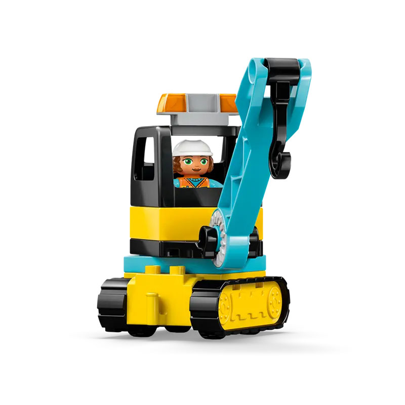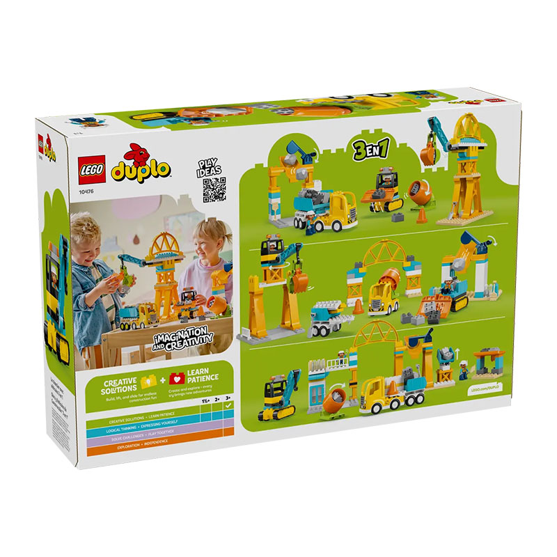 Barvit in ustvarjalen set, ki malčkom omogoča prve zabavne korake v svet sestavljanja. Otroci lahko sestavljajo in upravljajo različna vozila, kot so buldožer z dvigovalnim koritom, prekucnik, mešalnik betona z vrtečim bobnom in žerjav z gibljivo roko in nagibnim koritom. Kocke je mogoče uporabiti tudi za gradnjo visokega žerjava, nakladalne postaje ali mostu, pod katerega vozila vozijo. Set vključuje dve figurici delavcev, s katerima malčki prenašajo kocke in premikajo gradbene elemente, kar spodbuja domišljijo, prostorsko zaznavanje, fino motoriko in reševanje problemov. Enostavne, varne in prijetne kocke LEGO DUPLO so
