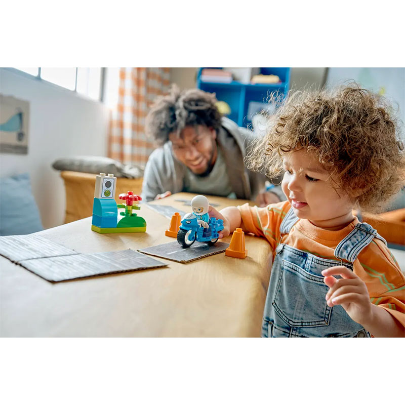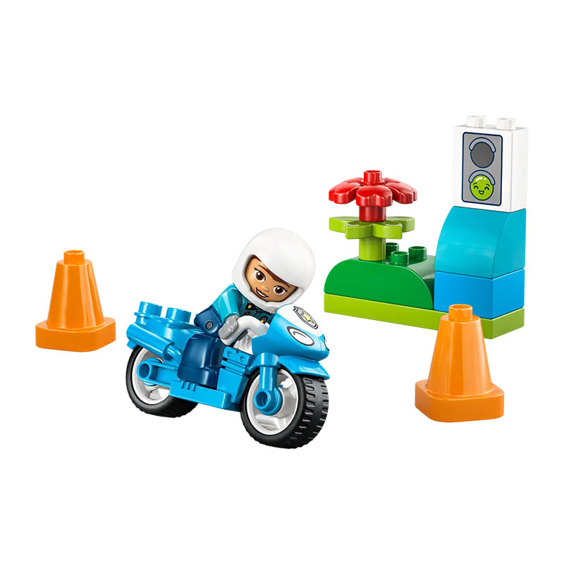 Barvit in ustvarjalen set, ki malčkom omogoča prve zabavne korake v svet sestavljanja. Otroci se skozi domišljijsko igro vživijo v vlogo policistke, ki se z motorjem odpravi na patruljo in skrbi za red na cestah. Enostavne, varne in prijetne kocke LEGO DUPLO so