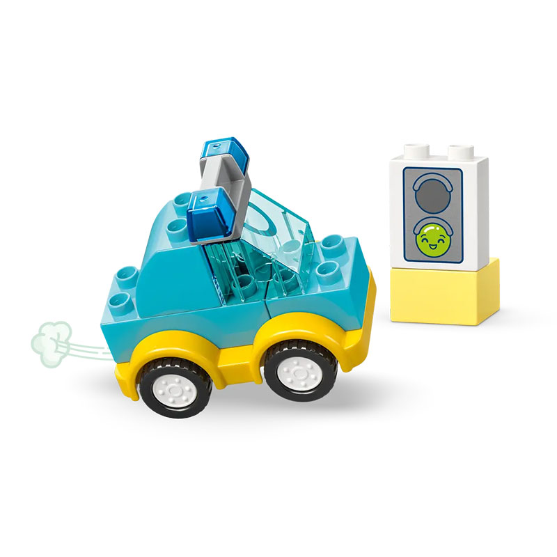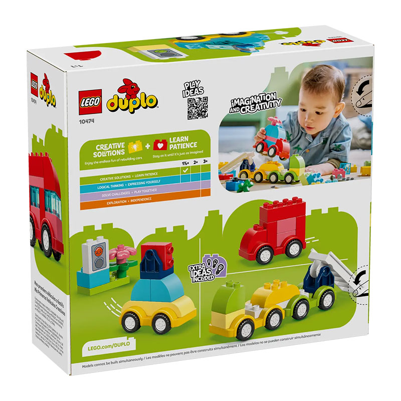 . Nato lahko kocke razstavijo, jih poljubno kombinirajo in ustvarjajo povsem nova vozila, s čimer spodbujajo domišljijo, fino motoriko in koordinacijo rok ter oči. Enostavne, varne in prijetne kocke LEGO DUPLO so
