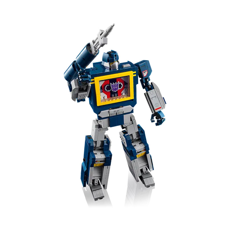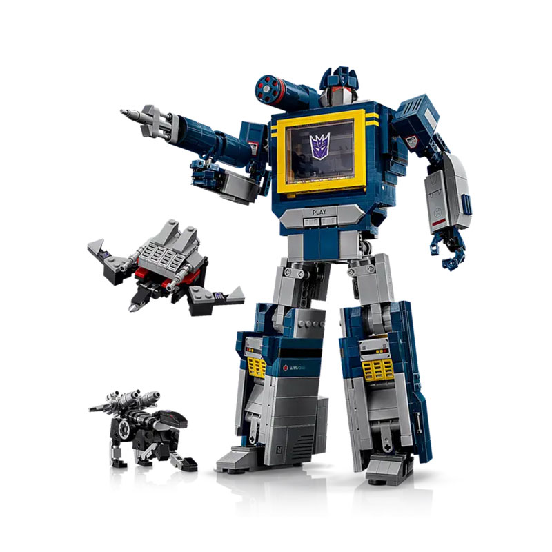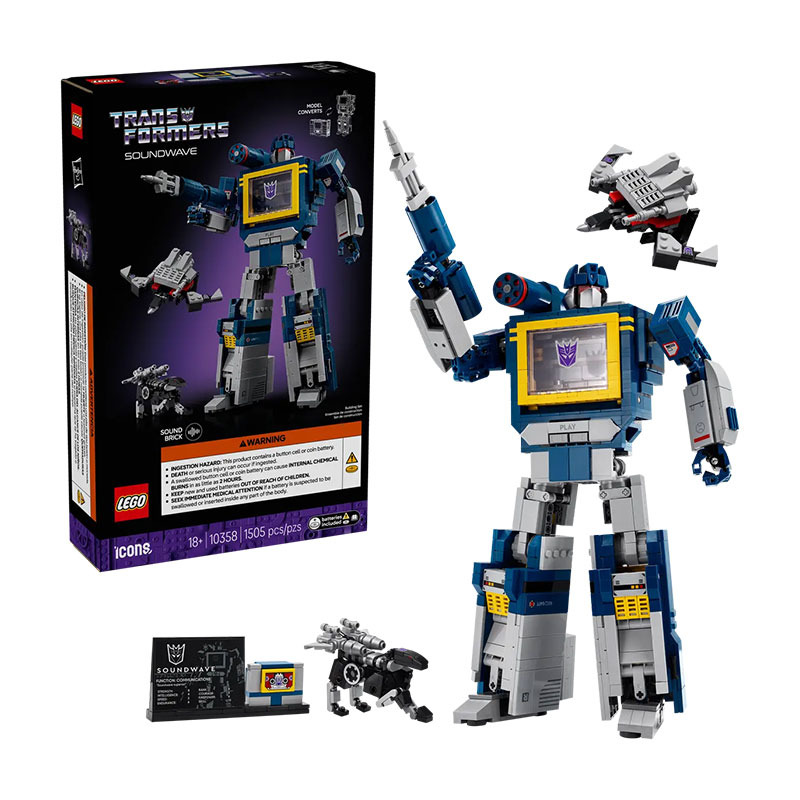 skupaj z njegovimi zvestimi spremljevalci, Ravageom in Laserbeakom. Pritisk na Soundwaveov gumb za predvajanje sproži posebne posnete glasovne in zvočne učinke, medtem ko figura vključuje raketni pod, laserski blaster in puščice ter gibljive sklepe. Soundwave se brez razstavljanja