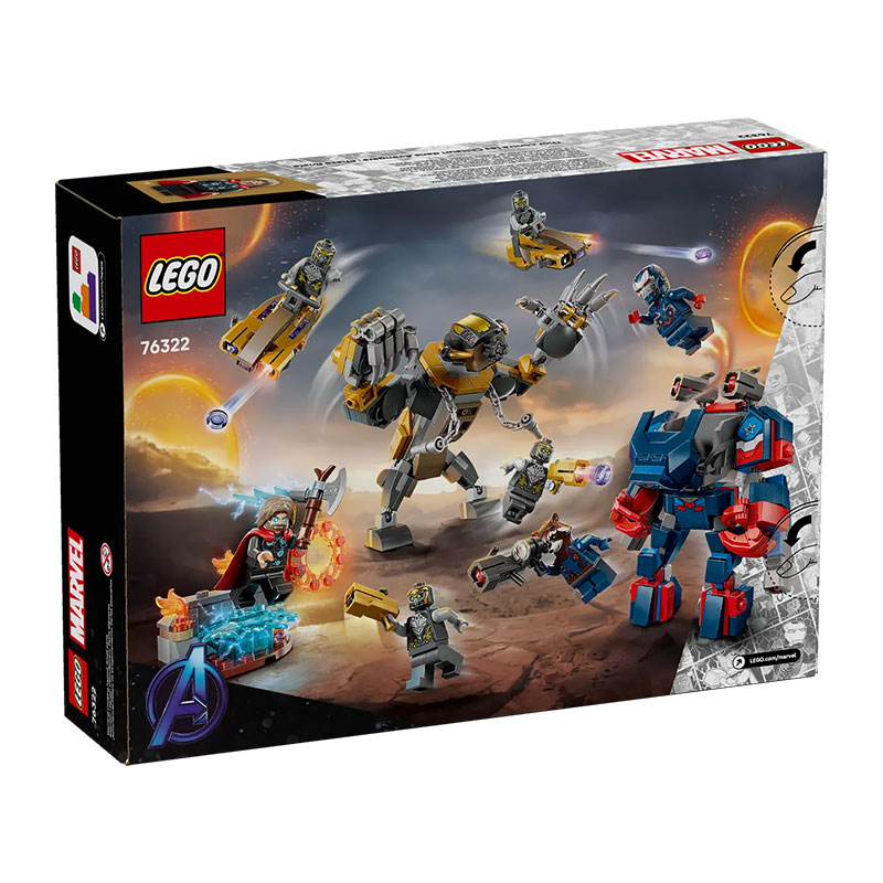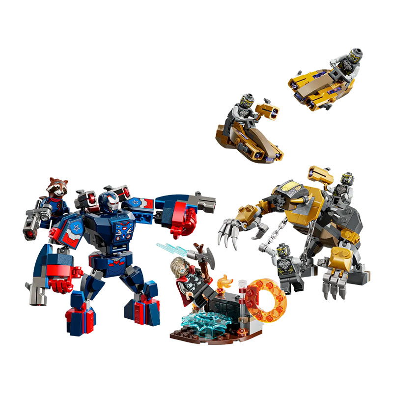: Iron Patriot MK2, Rocket z velikim izstreljevalcem kroglic, Thor s svojim Stormbreakerjem ter 4 Chitauri, od katerih imata dva zlati izstreljevalec kroglic. Poleg mini figur set vsebuje tudi 2 velike LEGO figure: Iron Patriot mech s štirimi izstreljevalci kroglic in grozljivega Chitauri gorila.