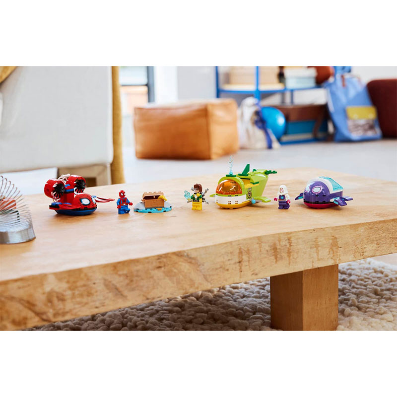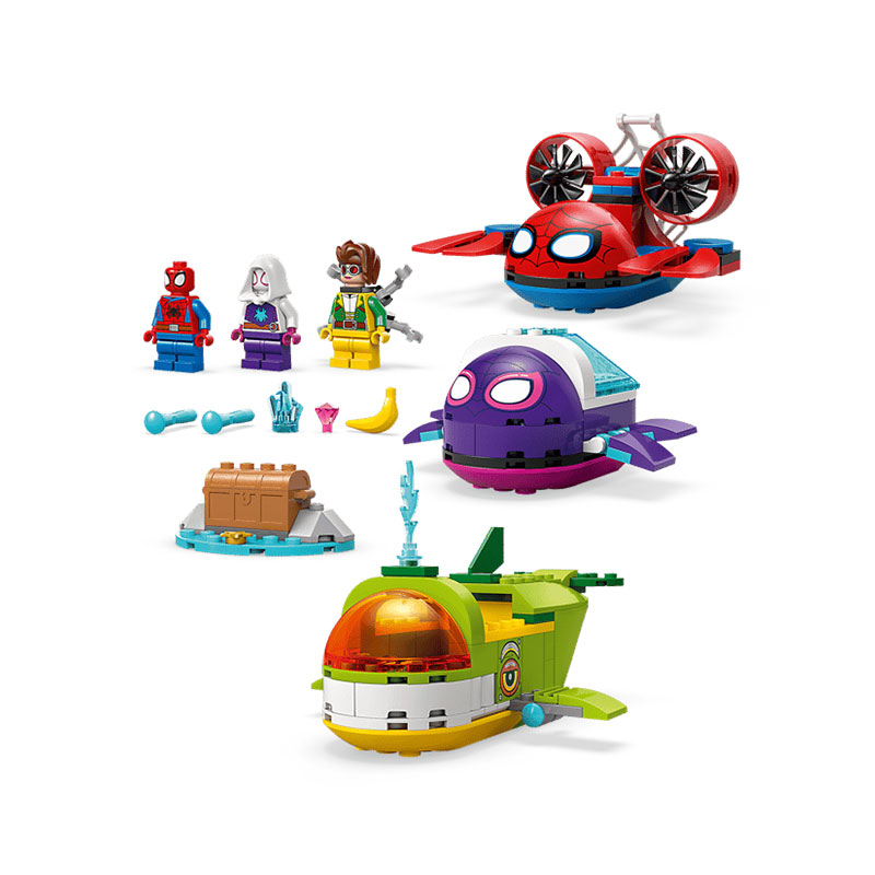 – Spideyjevo podmornico v obliki raka z veliko pajkovo mrežo, Ghost-Spider podmornico želvo z odpirajočo se prozorno lupino in Doc Ockovo podmornico kit s strelci na plavutih in prostorom za zakladnico. Komplet vključuje minifigure Spideyja, Ghost-Spider in Doc Ocka, kar omogoča igranje vlog in podvodne pustolovščine.
