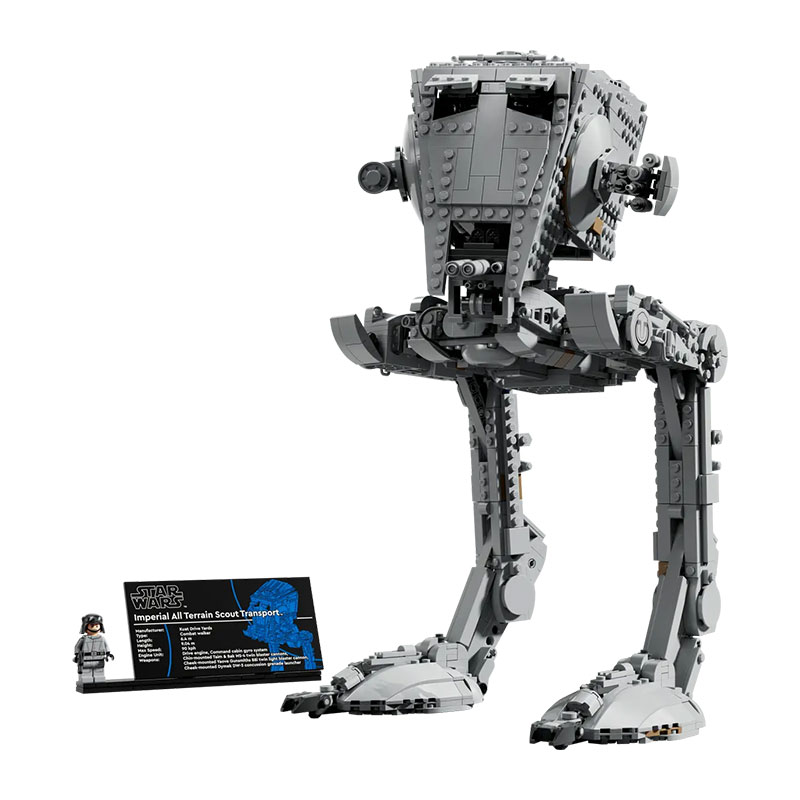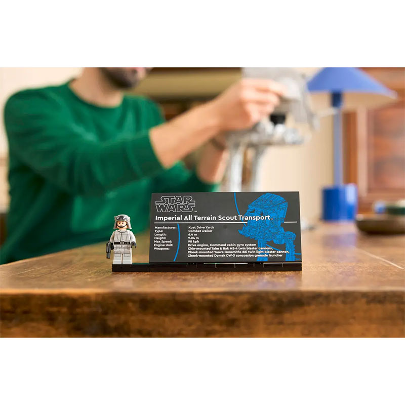 AT-ST, odpiranjem in zapiranjem loput na oknih ter nastavljanjem laserskih topov. Komplet vključuje informativno ploščico in ekskluzivno LEGO® Star Wars minifiguro AT-ST Driver z natisnjenim imperijskim grbom na rokah, ki dopolni dramatičen zbirateljski eksponat.