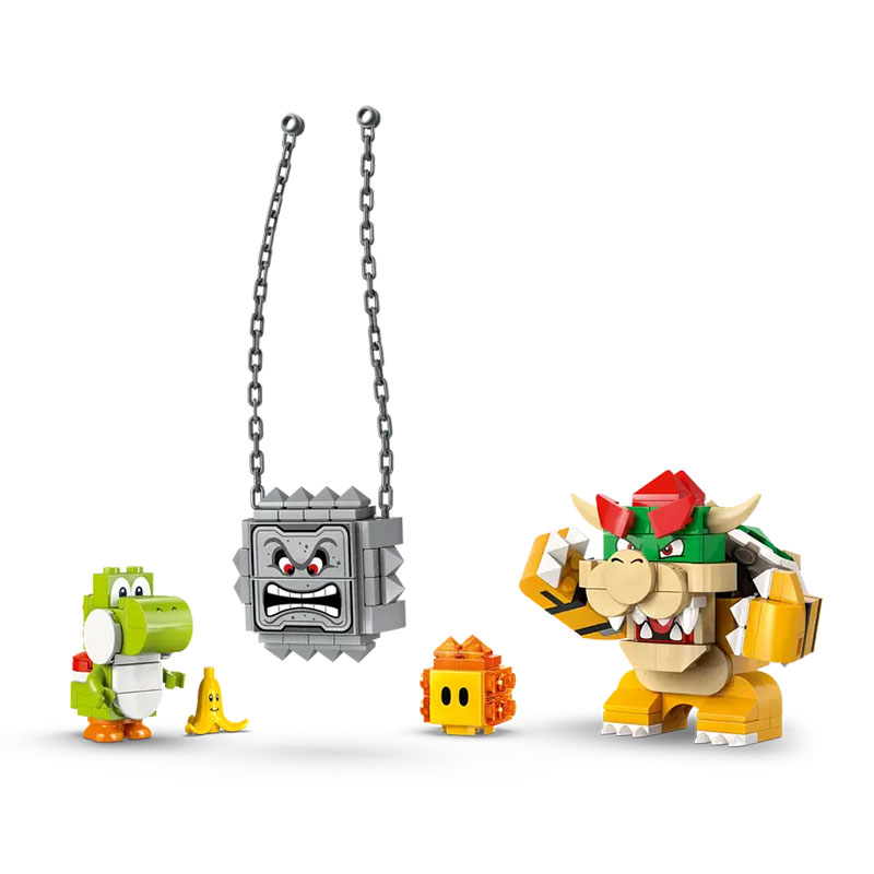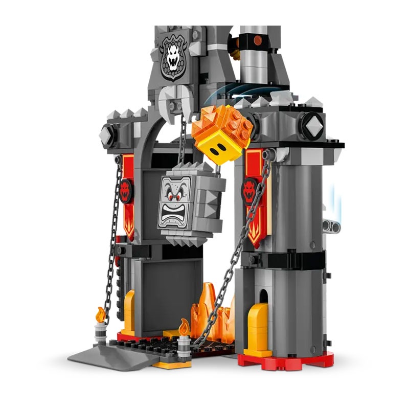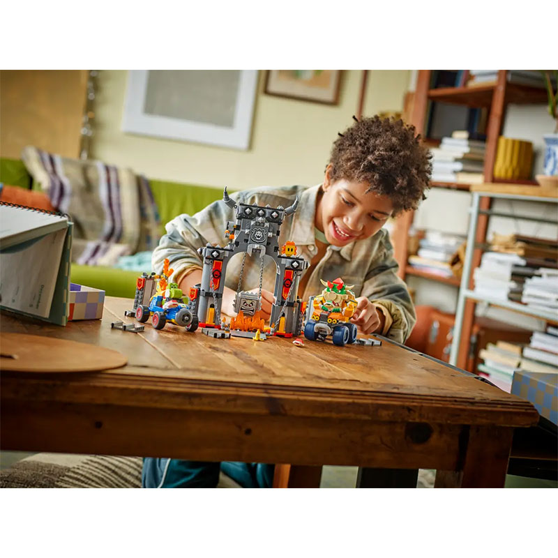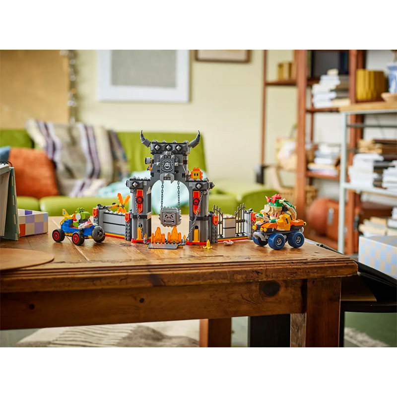 z razširljivimi stenami, vrtečo se ognjeno palico, skrivnimi funkcijami in prostorom, kjer lahko Bowser stoji na vrhu svojega gradu ter nadzoruje dirko. Z Bowserjem v vozilu Standard ATV in Yoshijem v Mach 8 gokartu se podajte v napeto tekmo – prebijajte se skozi zidove, izogibajte se nevarnemu Thwompu, premagajte Lava Bubble in sprožite izstreljevanje školjk. Set vsebuje štiri mini figurice: Bowserja, Yoshija, Thwompa in Lava Bubble.