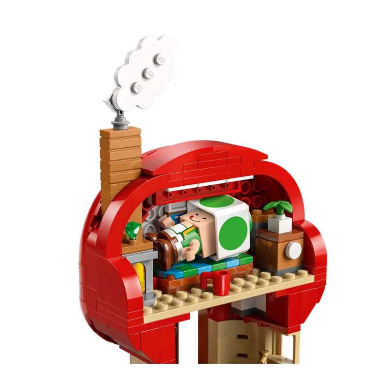 , polno podrobnosti, kjer se odvija prava rojstnodnevna zabava. V notranjosti hiše je kuhinja in spalnica s sliko Peachinega gradu na steni, pohištvo pa je odstranljivo, kar omogoča enostavno in zabavno igro. Zunaj pa čaka piknik miza s sedeži, gramofon s premično ploščo in obilica zabavnih dodatkov, ki ustvarijo pravo praznično vzdušje. Vključeni sta 2 mini figuri: Blue Toad in Green Toad.