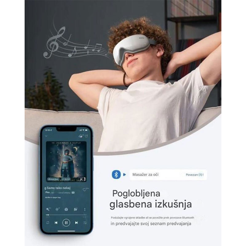Inovativna masažna naprava za oči Renpho je zasnovana za lajšanje napetosti in utrujenosti oči po dolgem dnevu. Z uporabo kombinacije nežnih zračnih blazin, toplote in vibracij zagotavlja sprostitev ter izboljšuje prekrvavitev v predelu oči. Naprava je opremljena z nastavljivimi programi, ki vam omogočajo, da izberete želeni način masaže glede na svoje potrebe. Je ergonomsko oblikovana, udobna ter enostavna za uporabo. Omogoča tudi Bluetooth povezavo za poslušanje glasbe med masažo, kar prispeva k dodatni sprostitvi. Deluje na baterije in se enostavno polni prek USB kabla.