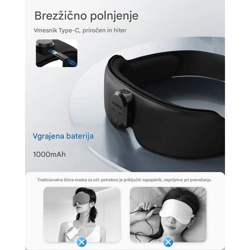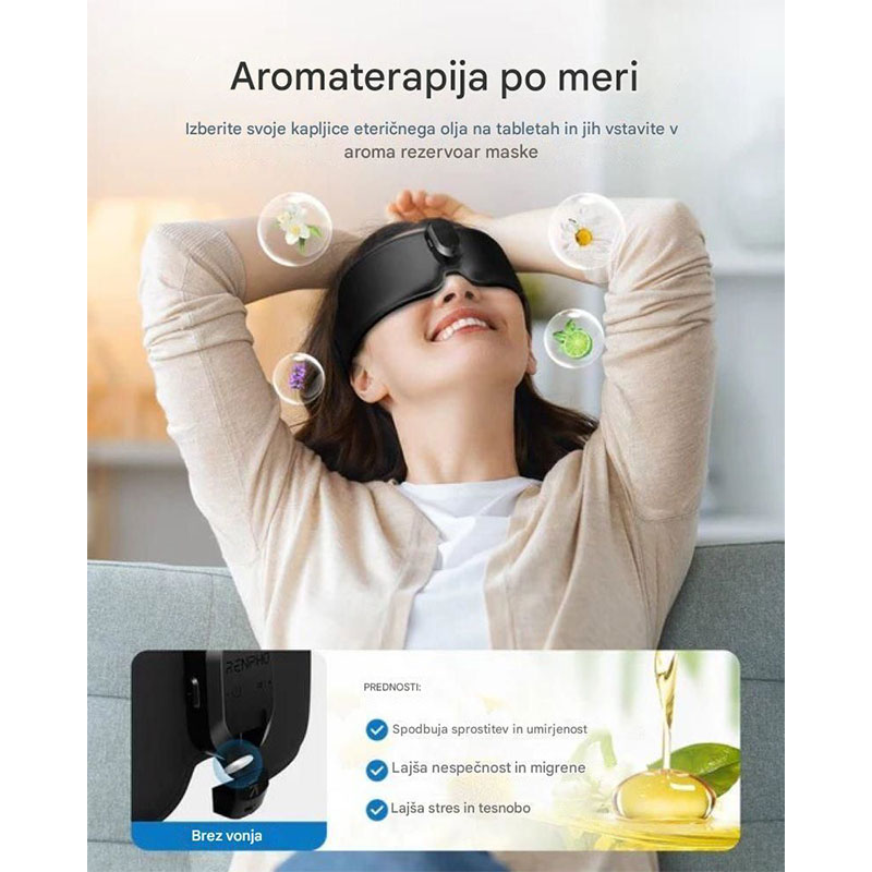 Napredna maska za spanje, ki združuje ogrevano kompresijo, prilagojeno aromaterapijo in Bluetooth zvočnike za popolno sprostitev in globok, miren spanec. Ergonomska 3D zasnova učinkovito blokira svetlobo, pomirjujoča toplota in zvok pa pomagata umiriti telo in misli pred spanjem. Ogrevana kompresijska maska ponuja tri nastavitve temperature med 40 °C in 45 °C z nadzorom stalne temperature ter hitrim segrevanjem, kar pomaga sprostiti očesno okolico in zmanjšati napetost po dolgem dnevu.