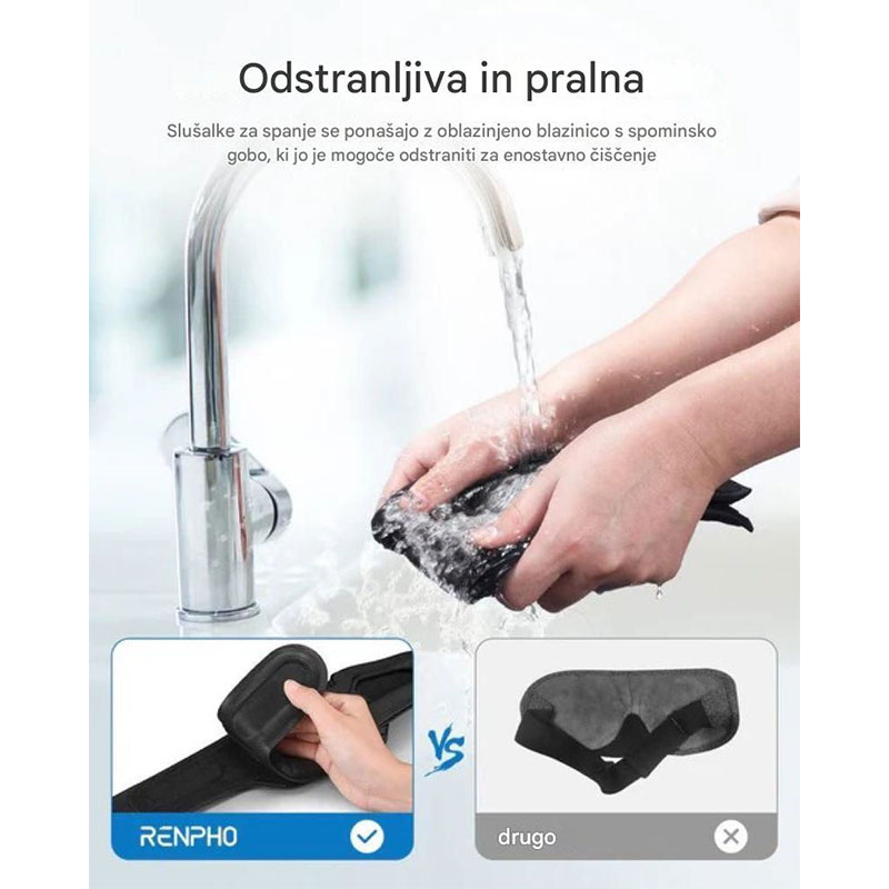 Vgrajeni Bluetooth zvočniki poskrbijo, da lahko poslušate svojo najljubšo glasbo, meditacije ali pomirjujoče zvoke. Na voljo so časovniki samodejnega izklopa (15, 30 ali 60 minut) ali delovanje brez časovne omejitve, da masko popolnoma prilagodite svojemu spalnemu ritmu. Posebne aromaterapevtske tablete omogočajo uporabo eteričnih olj po vaši izbiri ter ustvarjajo pomirjujoče okolje za lažje uspavanje. 3D ergonomska oblika in mehka penasta obloga učinkovito blokirata svetlobo in delno hrup, kar pripomore k globljemu in kakovostnejšemu spancu. Odstranljiva in pralna zračna blazina pa omogoča enostavno vzdrževanje.